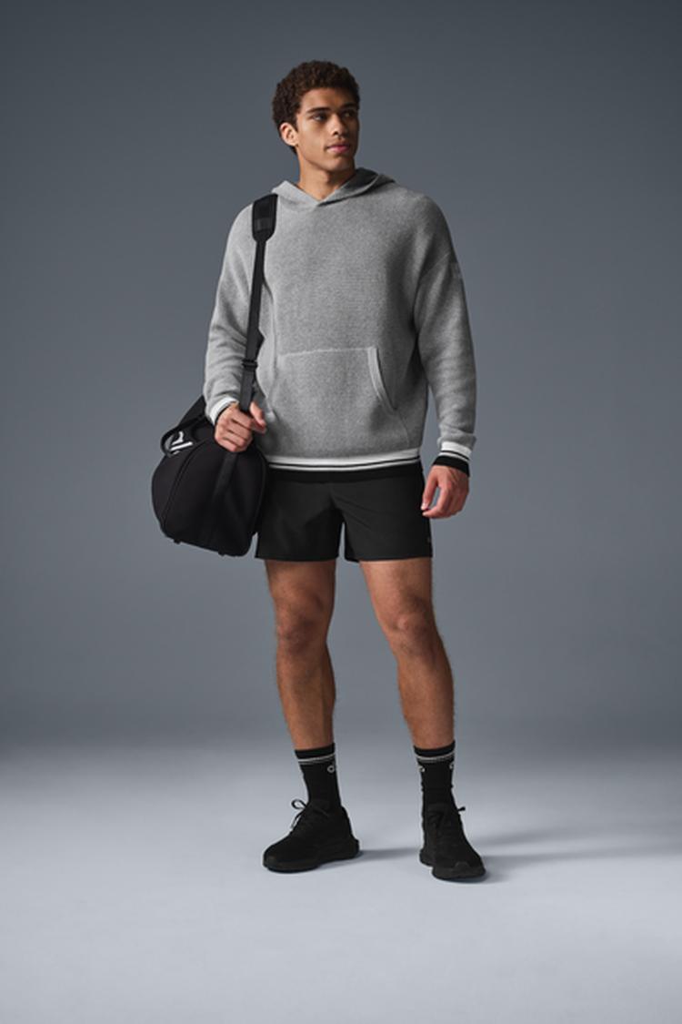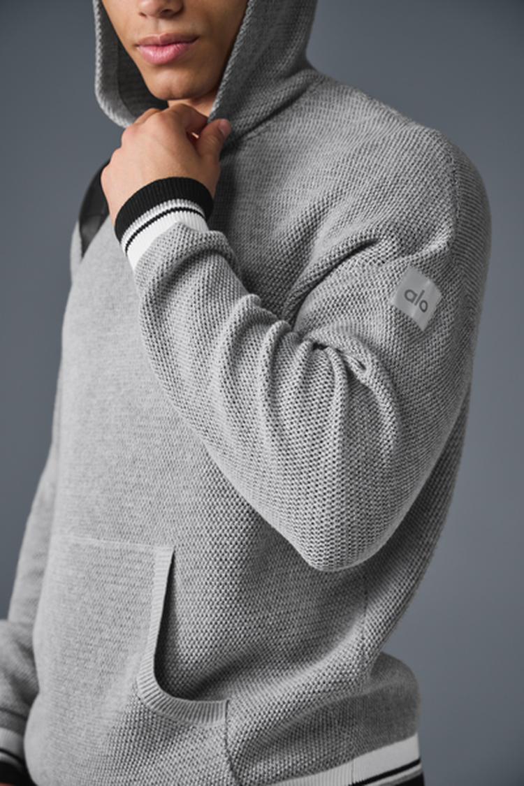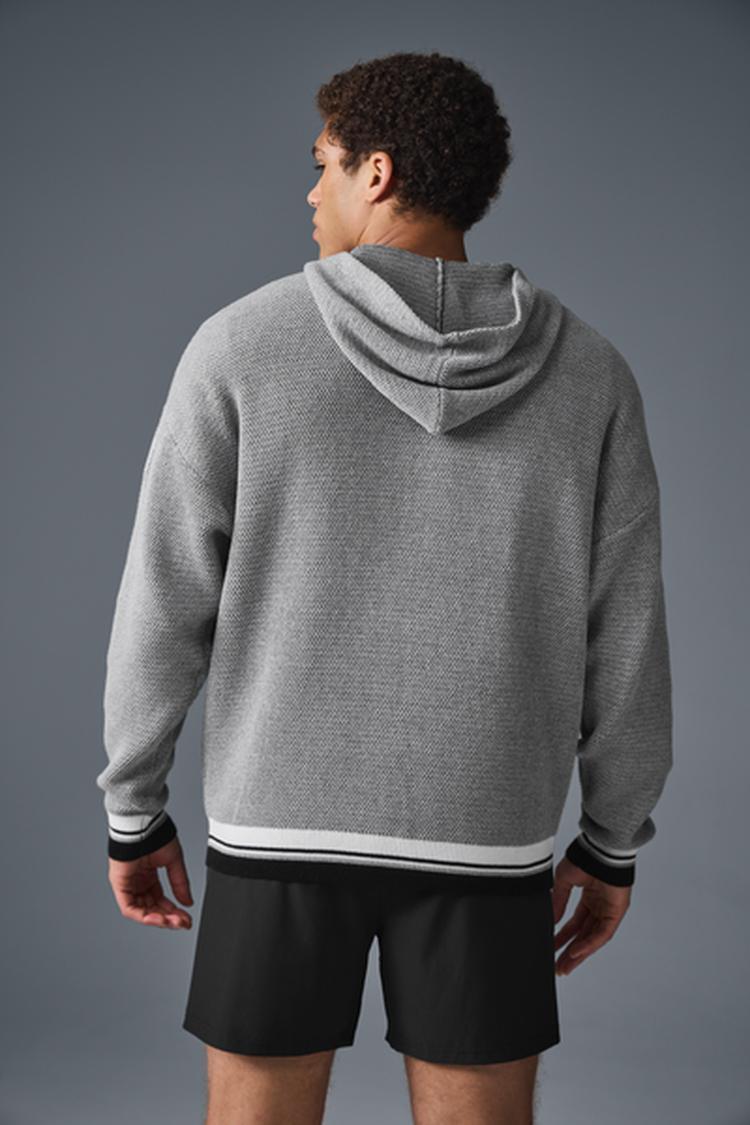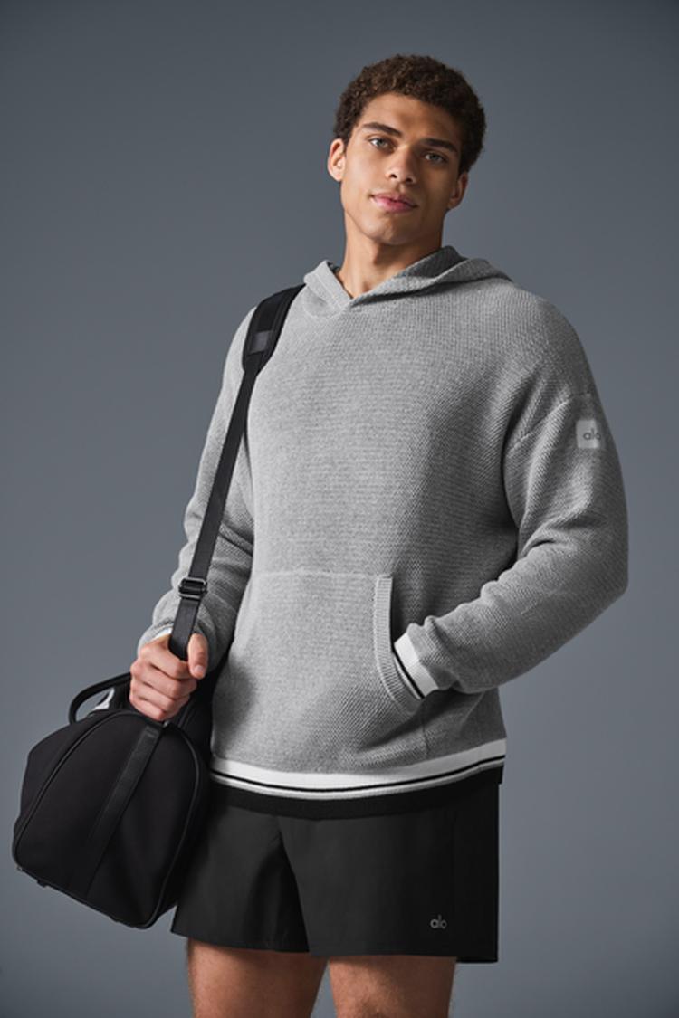 The perfect balance between preppy and sporty, this hoodie is a knitted take on a classic style. It's designed with a drapey, dual-toned sweater fabric that features a touch of texture, a roomy center pocket, varsity striped cuffs, and a relaxed fit for a versatile vibe you can style up or down.